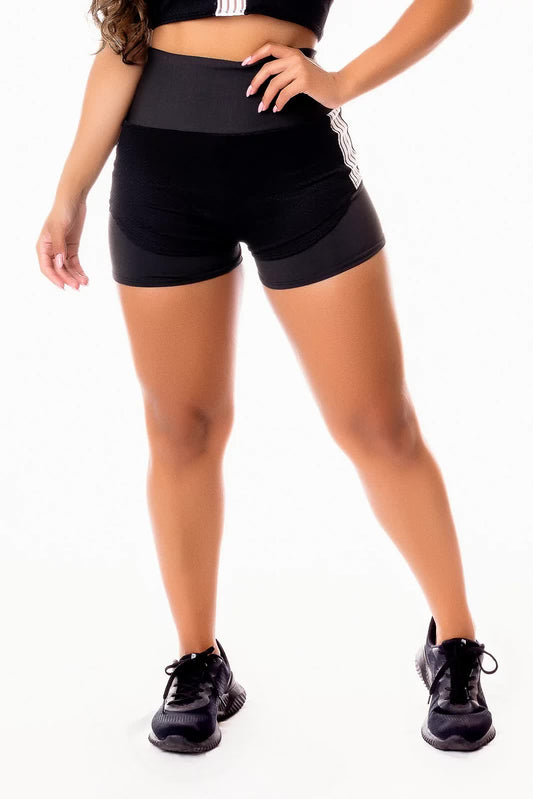 Short Fitness Academia Preto com Tela Dry Fit e Elástico Branco Cintura Alta REF: SV8