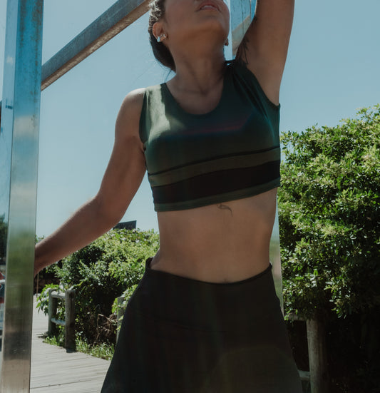 Calça Legging Preta com Verde Militar Cintura Alta e Cropped Regata com Detalhes em Tela Academia Conjunto Fitness | REF: CSV7